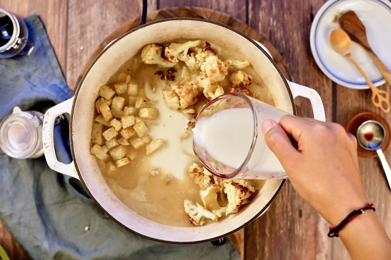 I find that using a combination of vegetable stock and almond milk (or any other non-dairy milk) in equal amounts provides the right consistency for the soup, but if you would prefer a creamier soup, swap out a cup of stock for milk.