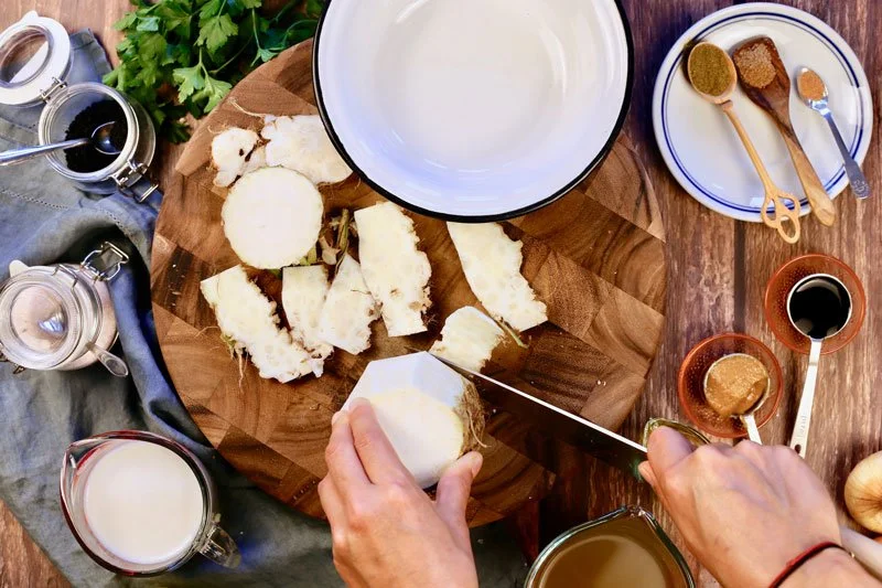 The celery root has an uneven exterior, so easiest way to clean it is to cut off both ends and then go around and peel it with your knife. Be sure to keep the discards, along with the onion peels and parsley stems, place in a bag and store in the freezer. I usually collect all types of discards when I cook - from peppers, carrots, celery stalks, etc., keep them in a designated bag in the freezer and use them to make vegetable stock once a week.