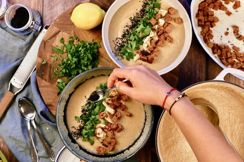 - Serve the soup warm, garnished with the roasted cauliflower florets, croutons, parsley and black cumin seeds. - Bon appetit!