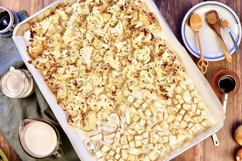 - Place the cauliflower florets into a large bowl, add half of the cumin, coriander, salt, black pepper and olive oil, and mix well. Transfer to a parchment paper lined baking sheet. Place the celeriac in the same bowl, add the remaining half of the spices, mix well and transfer to the baking sheet. Place the bulb of garlic in the tray as well, breaking up the cloves (but do not peal them), and bake for 25 min or until the florets begin to brown.