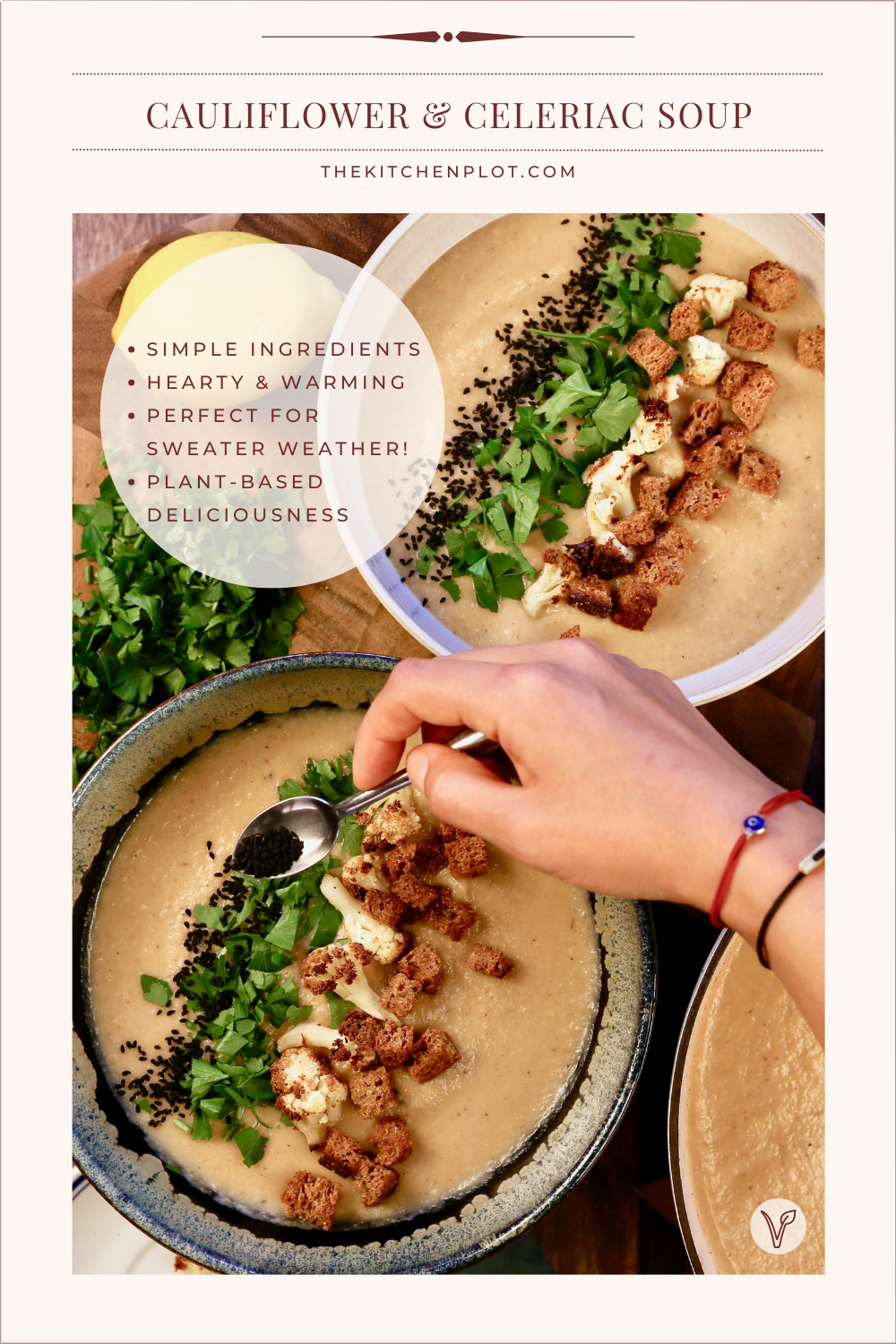Garnishes are an important part of the presentation … I often use so many that it almost looks like a meal on its own! Here I kept a few of the roasted cauliflower florets, used some sourdough crackers, which added crunchiness, chopped parsley and some black cumin seeds.